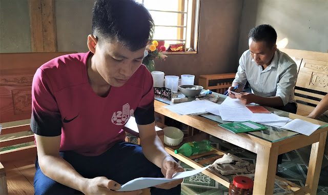 Au bout d’une heure de petites routes de montagne, nous sommes enfin arrivés au village de Lao et c’est dans la maison du chef du village que Bau fait le point sur ses chantiers.